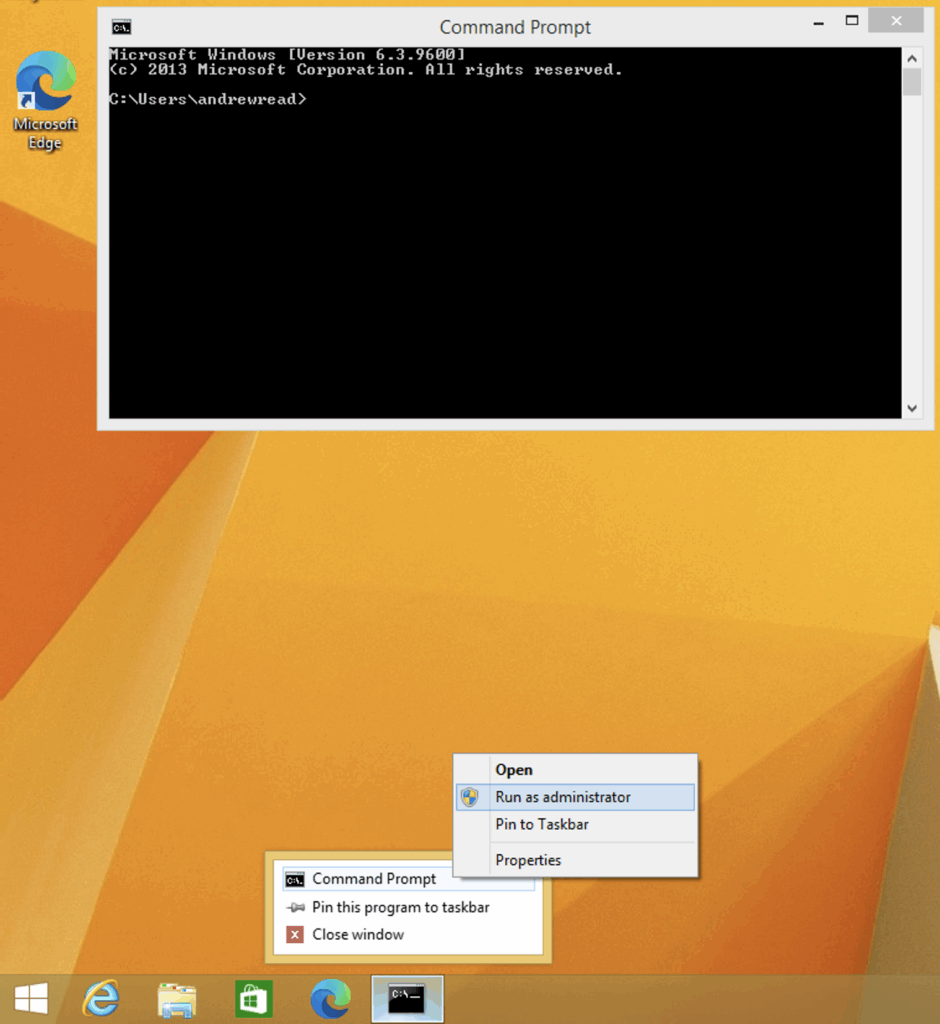 Start by opening an Administrators Command Prompt: this can be achieved by clicking Start , then type ‘cmd’ then press return. The cmd prompt will not have administrative access so secondary click it on the task bar, then secondary click ‘Command Prompt’ in the menu then ‘Run as administrator’.
